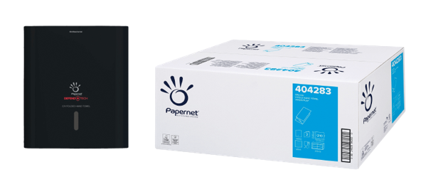 Dozownik Papernet do ręczników w składce V czarny + Ręcznik papierowy w składce celulozowy biały 2 warstwowy 21 x 22 cm