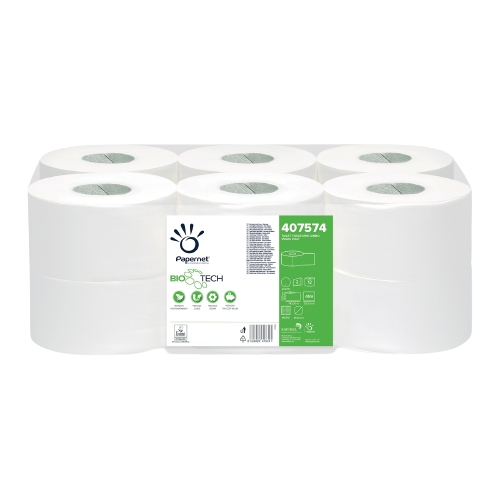 - Papier toaletowy w Mini Jumbo roli Papernet Biotech (407574) – opakowanie zbiorcze, czyli 12 rolek po 140 mb dwuwarstwowego, celulozowego papieru toaletowego