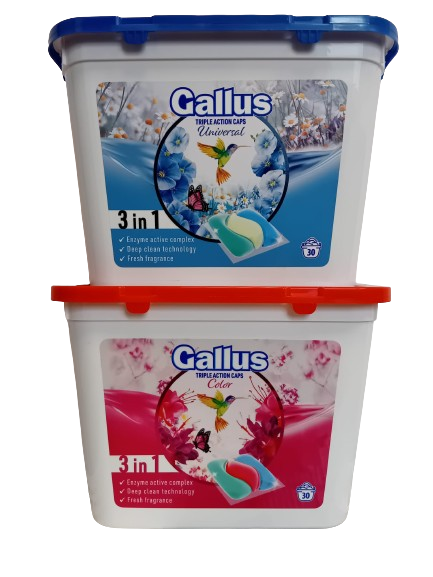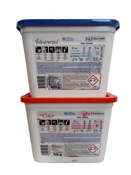 Oferowane Kapsułki Gallus 30 szt opierają swoje działanie na zaawansowanej formule 3 w 1, która podczas jednego cyklu skutecznie czyści, pielęgnuje włókna i chroni je przed przedwczesnym zniszczeniem. To oryginalna chemia z Niemiec, której składniki aktywne wnikają głęboko w materiał, wywabiając najcięższe zabrudzenia nawet w niższych temperaturach. Możesz bez problemu dopasować je do zawartości swojej szafy. Kapsułki występują w wersji Uniwersalne, która idealnie nadaje się do prania białych i jasnych tkanin (w zakresie od 30°C do 95°C), oraz w wersji Kolor, dedykowanej do ubrań kolorowych i ciemnych (skutecznej w temperaturach od 30°C do 60°C).