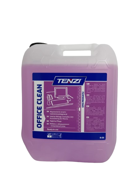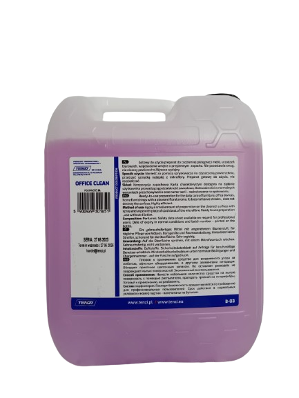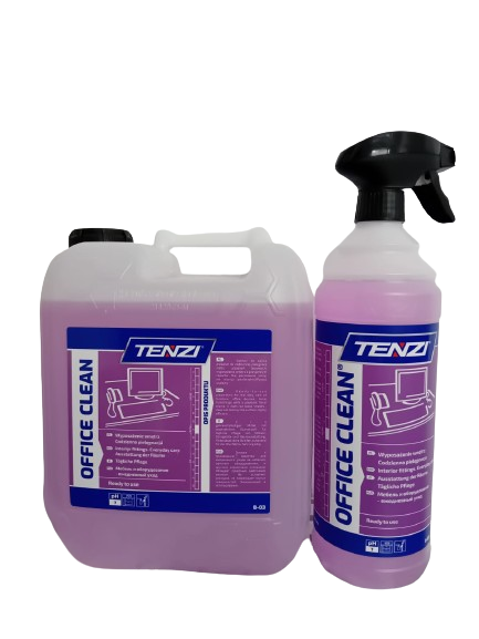 Prezentowany preparat Office Clean marki Tenzi w butelce o pojemności jednego litra to środek całkowicie gotowy do bezpośredniego użycia. Wygodny spryskiwacz mocno ułatwia aplikację na różnorodne powierzchnie takie jak zabezpieczone drewno plastik szkło oraz laminat. Płyn ten dokładnie czyści i bardzo szybko wysycha nie pozostawiając przy tym żadnych nieestetycznych smug. Dodatkowo nadaje widoczny połysk matowym i błyszczącym elementom wyposażenia a po skończonej pracy pozostawia w całym pomieszczeniu bardzo przyjemny kwiatowy zapach.