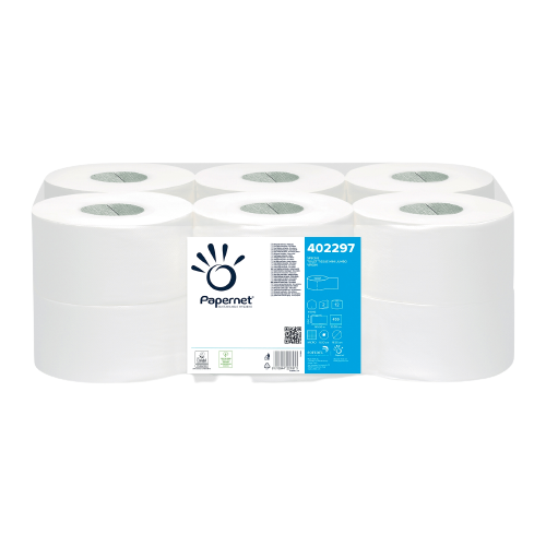 - Papier toaletowy w Mini Jumbo roli Papernet (402297)– opakowanie zbiorcze, czyli 12 rolek po 140 mb dwuwarstwowego, celulozowego papieru toaletowego